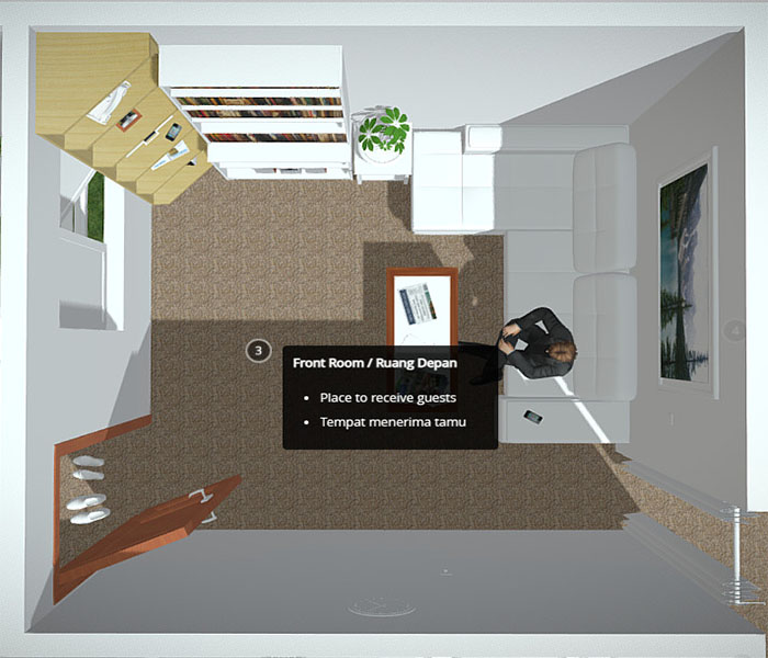 Biasa disebut dengan ruang tamu, untuk menerima tamu yang datang. Ruangan ini cukup luas untuk menampung 12 orang tamu, ukuran panjang 3,4m dan lebar 3m.