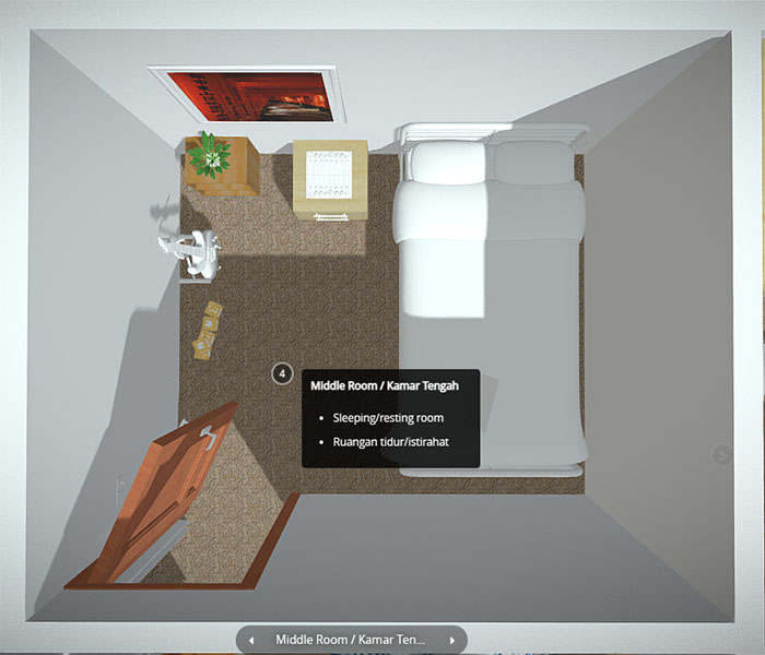 Bagi yang beragama muslim, ruangan ini biasanya dipakai untuk tempat shalat, memiliki ukuran panjang 2m dan lebar 2m.