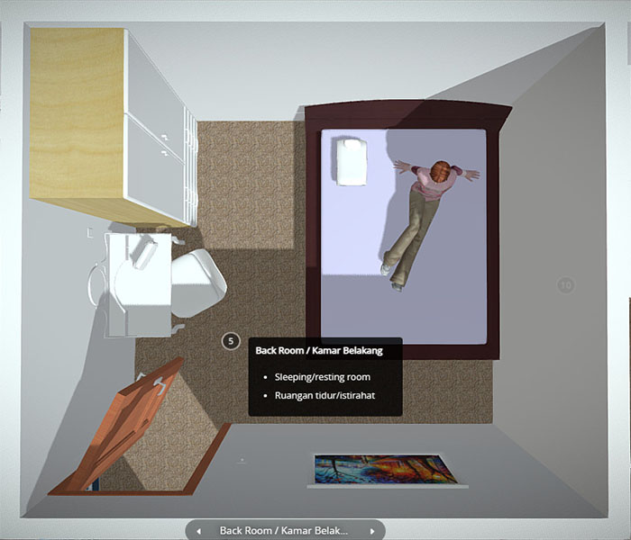 Digunakan untuk tempat istirahat dan tidur, cocok sekali untuk kamar anak, ruangan ini memiliki ukuran panjang 3m dan lebar 2,5m.